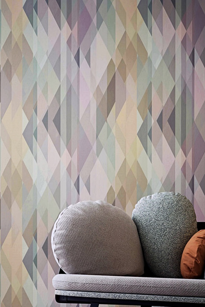 Tapeta dostępna jest w dwóch odsłonach kolorystycznych. Ta pastelowa wersja to subtelna mozaika delikatnych barw: alabastrowego różu, taupe, szałwiowego srebra i lilii, tworząca eleganckie, stonowane tło do bardziej wyrafinowanych aranżacji.