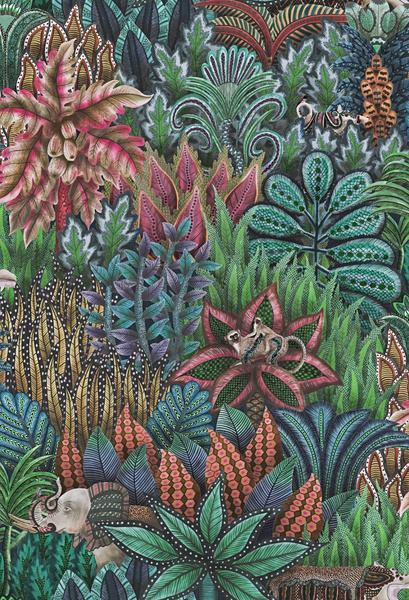 Ręcznie malowane liście, gęste motywy roślinne oraz tajemnicze, fantazyjne zwierzęta autorstwa Alexa Sibande przeplatają się, tworząc kompozycję przypominającą gobelin. Odcień Viridian Multi nadaje wzorowi elegancji i głębi, doskonale sprawdzając się zarówno w nowoczesnych, jak i klasycznych aranżacjach.