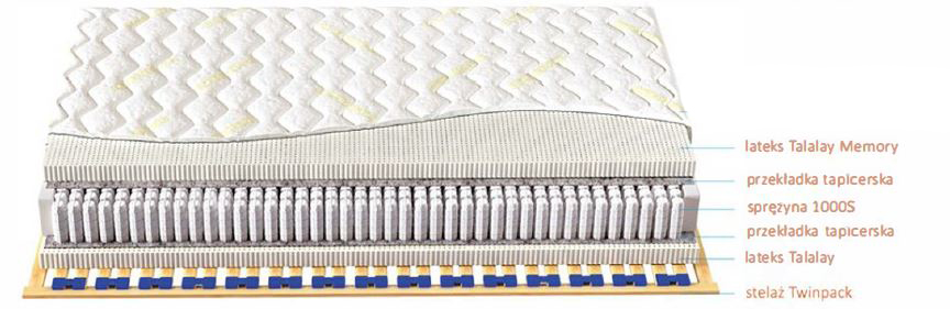 Wkład materaca wykonany jest ze sprężyn woreczkowych klejonych punktowo. Znajdują się one w oddzielnych kieszonkach zwiększając niezależność pracy pojedynczych sprężyn, a tym samym poprawiając elastyczność materaca. W materacu Venus Multi Pocket Talalay o wymiarach 140cmx200cm znajduje się 1344 sprężyn. Wkład sprężynowy obłożony jest obustronnie przekładką tapicerską oraz z jednej strony warstwą naturalnego lateksu Talalay Memory 70mm o gęstości ok. 56kg/m3, a z drugiej strony warstwą lateksu Talalay o gęstości ok. 84kg/m3. Lateks Talalay Memory szybko dostosowuje się do temperatury ciała, a zatem przyspiesza zaśnięcie i wydłuża czas wypoczynku. W materacu nie rozwijają się bakterie I grzyby.