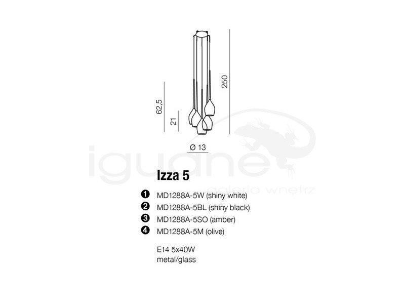 Kolekcja Izza to klasyka formy. Kształt klosza przypomina kielich i ma bardzo elegancki, proporcjonalny zarys. Duże zwisy idealnie wypełniają duże otwarte przestrzenie jak antresole, klatki schodowe. Mniejsze ładnie dekorują przestrzeń nad stołem lub blatem. Uzupełnieniem kolekcji są kinkiety oraz lampy stojące.