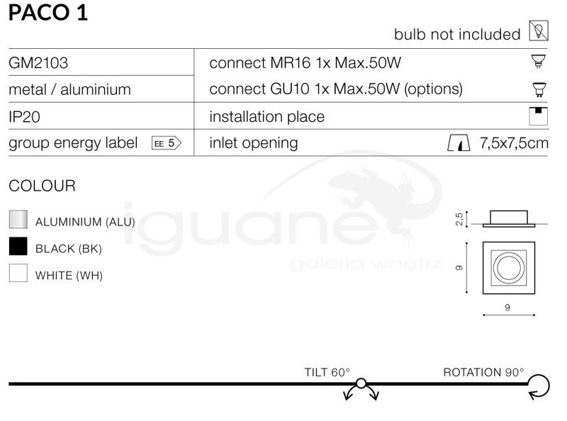 Źródło światła: | GU10 1x Max 50W |
