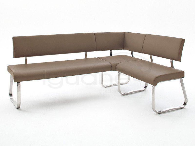 Ława narożna na płozie, stal szlachetna szczotkowana, siedzisko i oparcie gładkie, bez przeszyć, ekoskóra cappuccino