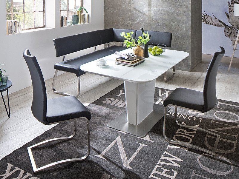 Ława narożna na płozie, stal szlachetna szczotkowana, siedzisko i oparcie gładkie, bez przeszyć, skóra czarna