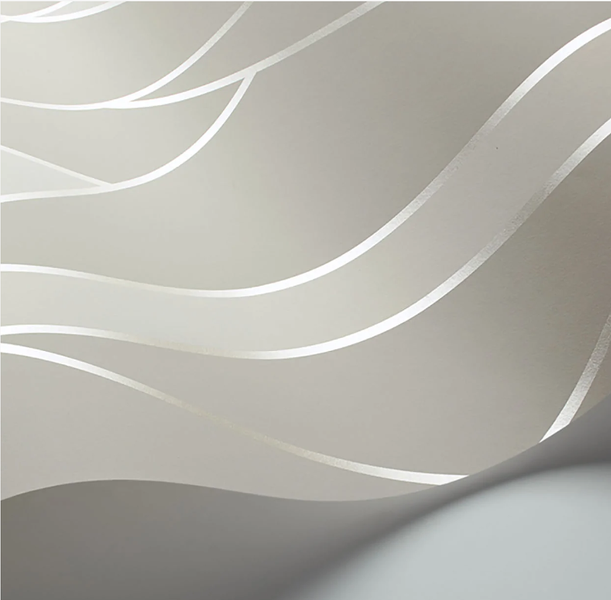 lśniącego metalu, tworząc klasycznie efektowną tapetę. Palety kolorów obejmują delikatne szarości ze srebrem, krem ​​na kości słoniowej ze złotem,