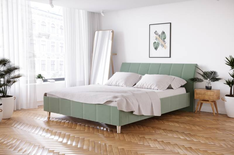 Łóżko z płyty w obiciu z tkaniny meblowej, do wyboru z grup materiałowych. Łóżko bez stelaża.