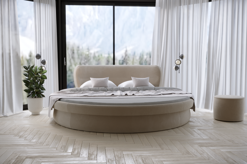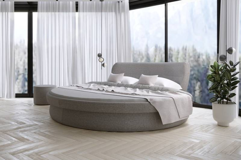 Łóżko z płyty w obiciu z tkaniny meblowej, do wyboru z grup materiałowych. Łóżko okrągłe, średnica 2,5m Łóżko ze stelażem i zagłówkiem.