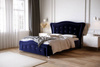 Łóżko z płyty w obiciu z tkaniny meblowej, do wyboru z grup materiałowych. Łóżko ze stelażem tworzącym pojemnik na pościel. Rama metalowa.