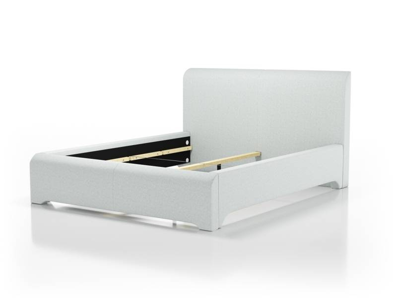 Łóżko z płyty w obiciu z tkaniny meblowej, do wyboru z grup materiałowych. Łóżko ze stelażem tworzącym pojemnik na pościel. Rama metalowa.