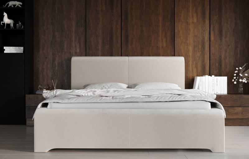Łóżko z płyty w obiciu z tkaniny meblowej, do wyboru z grup materiałowych. Łóżko ze stelażem tworzącym pojemnik na pościel. Rama metalowa.