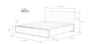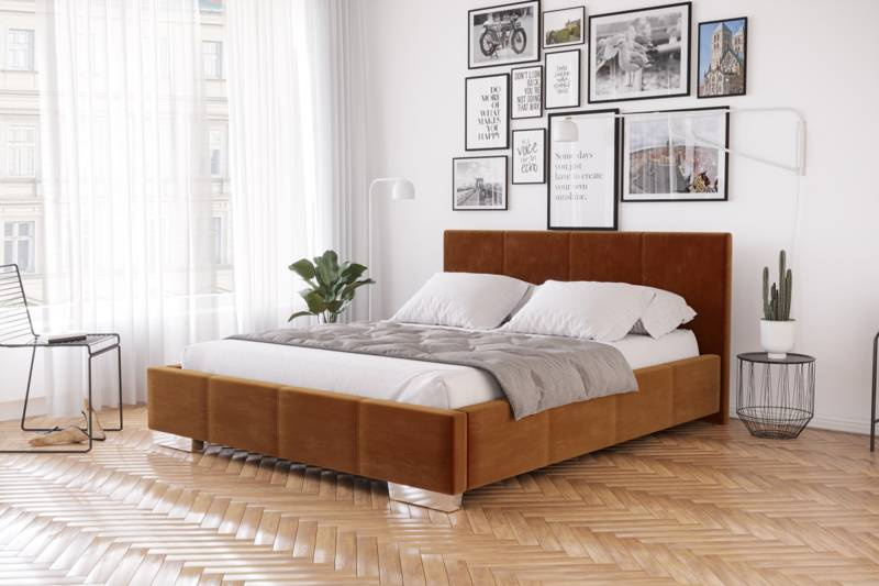 Łóżko z płyty w obiciu z tkaniny meblowej, do wyboru z grup materiałowych. Łóżko ze stelażem tworzącym pojemnik na pościel. Rama metalowa.
