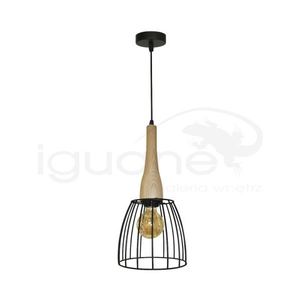 Lampa wisząca Terata o industrialnym charakterze, której metalowa forma została ocieplona dzięki drewnianym elementom.