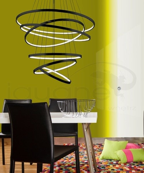Nowoczesny charakter lampy Wheel sprawdzi się w minimalistycznych wnętrzach. Bedzie ona niekwestionowaną ozdobą pomieszczenia a dostępne kolory (czarny, chrom lub złoty) podkreślają jej formę. Lampa ledowa składa się z 3 pierścieni o różnych średnicach 75, 60 i 45cm.