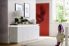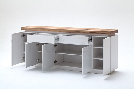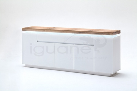 ROMINA komoda 5 drzwi 2 szuflady, lakier biały mat, blat dąb lity, sękaty, olejowany, oświetlenie LED białe z pilotem