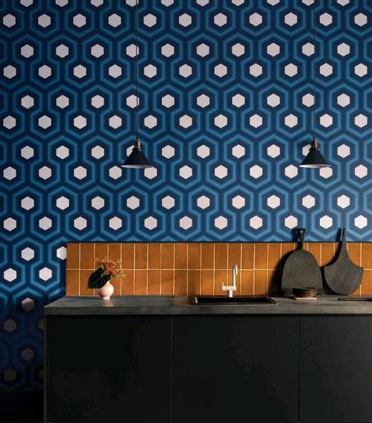 Ponadczasowy Hexagon Hicksa został powiększony do nowej, odważnej skali, aby stworzyć Hicks' Grand, uderzające geometryczny wzór z połowy wieku,