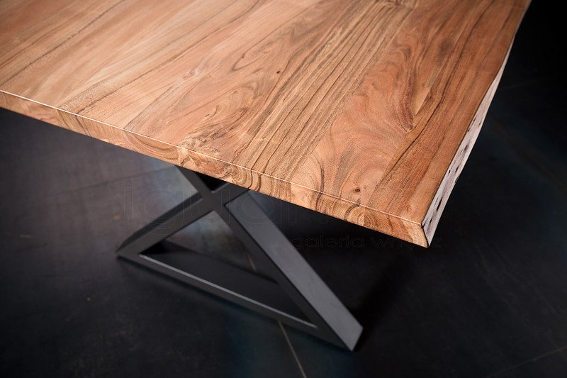 Unikatowy stół z drewnianym blatem o nieregularnych brzegach. Drewno akacjowe ma wyjątkowe wybarwienie a blat z desek eksponuje usłojenie drewna.