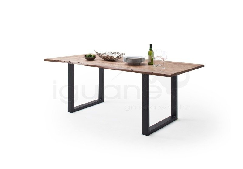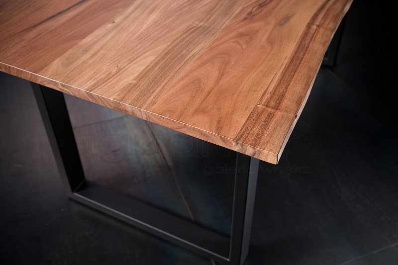 Unikatowy stół z drewnianym blatem o nieregularnych brzegach. Drewno akacjowe ma wyjątkowe wybarwienie a blat z desek eksponuje usłojenie drewna.