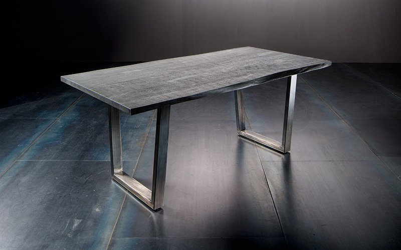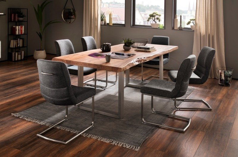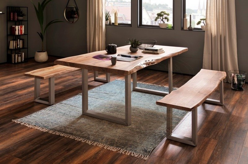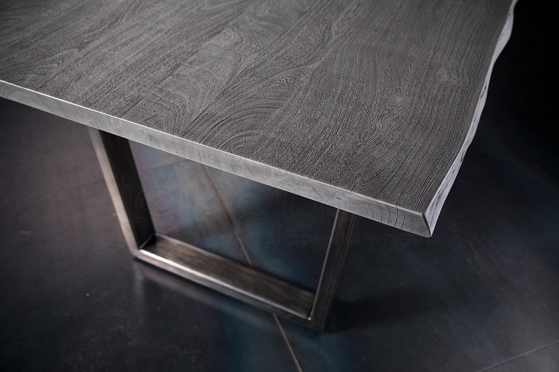 Unikatowy stół z drewnianym blatem o nieregularnych brzegach. Drewno akacjowe ma wyjątkowe wybarwienie a blat z desek eksponuje usłojenie drewna.