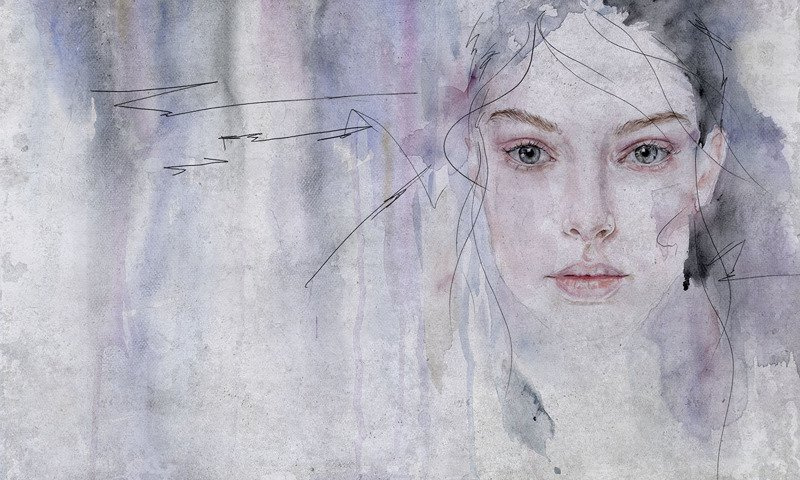 Subtelny wzór kobiecej twarzy podkreślony pięknie skomponowanymi wrzosowymi odcieniami.