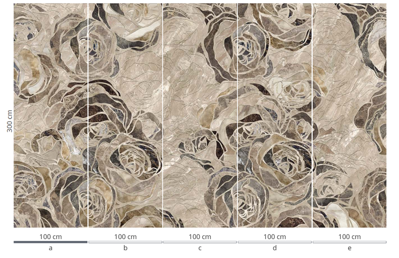 Murale marki Wonderwall sprzedajemy w rolkach o standardowych wymiarach: 100 cm x 300 cm. Jeśli wysokość waszego pomieszczenia jest mniejsza niż 3 metry, wówczas nadmiar tapety należy w odpowiednim miejscu odciąć. Na pełny wzór składa się pięć rolek: a, b, c, d i e. Można wybrać konkretne rolki dopasowując tapetę do swojego wnętrza. Lub można przygotować mural pod konkretny wymiar. W tym celu prosimy o kontakt pod mail sklep@iguane.pl