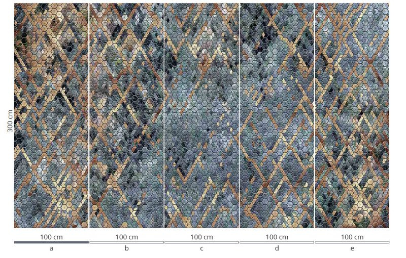 Murale marki Wonderwall sprzedajemy w rolkach o standardowych wymiarach: 100 cm x 300 cm. Jeśli wysokość waszego pomieszczenia jest mniejsza niż 3 metry, wówczas nadmiar tapety należy w odpowiednim miejscu odciąć. Na pełny wzór składa się pięć rolek: a, b, c, d i e. Można wybrać konkretne rolki dopasowując tapetę do swojego wnętrza. Lub można przygotować mural pod konkretny wymiar. W tym celu prosimy o kontakt pod mail sklep@iguane.pl