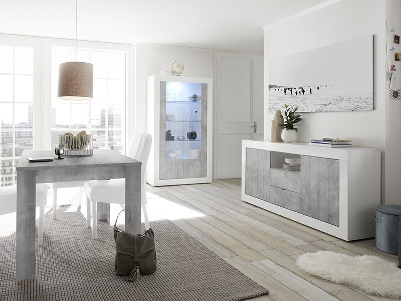 Witryna, 2 drzwi, korpus lakier biały wysoki połysk, front laminat beton