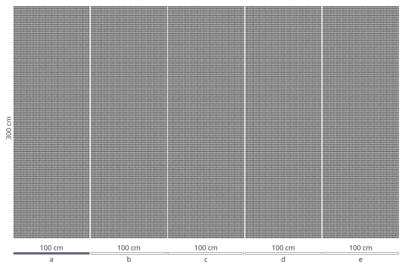 Murale marki Wonderwall sprzedajemy w rolkach o standardowych wymiarach: 100 cm x 300 cm. Jeśli wysokość waszego pomieszczenia jest mniejsza niż 3 metry, wówczas nadmiar tapety należy w odpowiednim miejscu odciąć. Na pełny wzór składa się pięć rolek: a, b, c, d i e. Można wybrać konkretne rolki dopasowując tapetę do swojego wnętrza. Lub można przygotować mural pod konkretny wymiar. W tym celu prosimy o kontakt pod mail sklep@iguane.pl