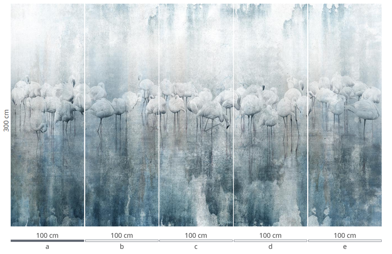 Murale marki Wonderwall sprzedajemy w rolkach o standardowych wymiarach: 100 cm x 300 cm. Jeśli wysokość waszego pomieszczenia jest mniejsza niż 3 metry, wówczas nadmiar tapety należy w odpowiednim miejscu odciąć. Na pełny wzór składa się pięć rolek: a, b, c, d i e. Można wybrać konkretne rolki dopasowując tapetę do swojego wnętrza. Lub można przygotować mural pod konkretny wymiar. W tym celu prosimy o kontakt pod mail sklep@iguane.pl