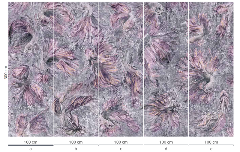 Murale marki Wonderwall sprzedajemy w rolkach o standardowych wymiarach: 100 cm x 300 cm. Jeśli wysokość waszego pomieszczenia jest mniejsza niż 3 metry, wówczas nadmiar tapety należy w odpowiednim miejscu odciąć. Na pełny wzór składa się pięć rolek: a, b, c, d i e. Można wybrać konkretne rolki dopasowując tapetę do swojego wnętrza. Lub można przygotować mural pod konkretny wymiar. W tym celu prosimy o kontakt pod mail sklep@iguane.pl