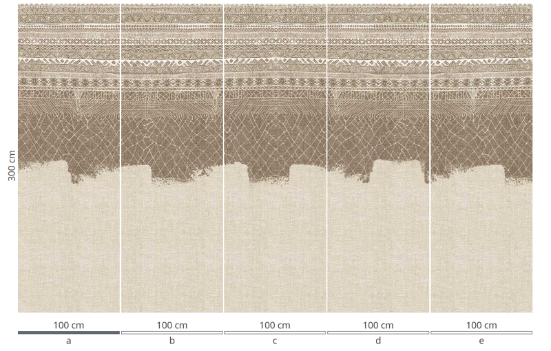 Murale marki Wonderwall sprzedajemy w rolkach o standardowych wymiarach: 100 cm x 300 cm. Jeśli wysokość waszego pomieszczenia jest mniejsza niż 3 metry, wówczas nadmiar tapety należy w odpowiednim miejscu odciąć. Na pełny wzór składa się pięć rolek: a, b, c, d i e. Można wybrać konkretne rolki dopasowując tapetę do swojego wnętrza. Lub można przygotować mural pod konkretny wymiar. W tym celu prosimy o kontakt pod mail sklep@iguane.pl