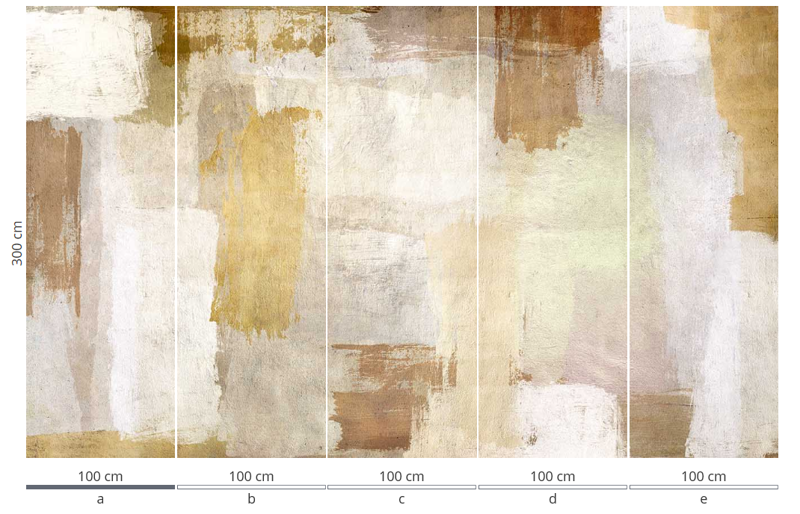Murale marki Wonderwall sprzedajemy w rolkach o standardowych wymiarach: 100 cm x 300 cm. Jeśli wysokość waszego pomieszczenia jest mniejsza niż 3 metry, wówczas nadmiar tapety należy w odpowiednim miejscu odciąć. Na pełny wzór składa się pięć rolek: a, b, c, d i e. Można wybrać konkretne rolki dopasowując tapetę do swojego wnętrza. Lub można przygotować mural pod konkretny wymiar. W tym celu prosimy o kontakt pod mail sklep@iguane.pl