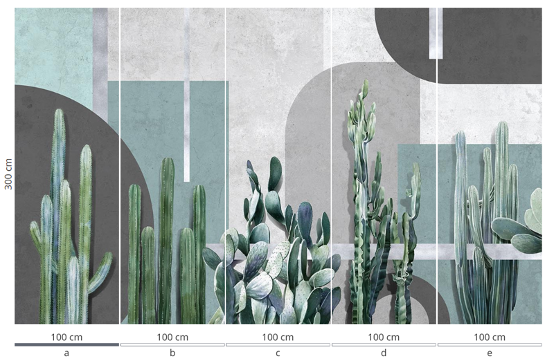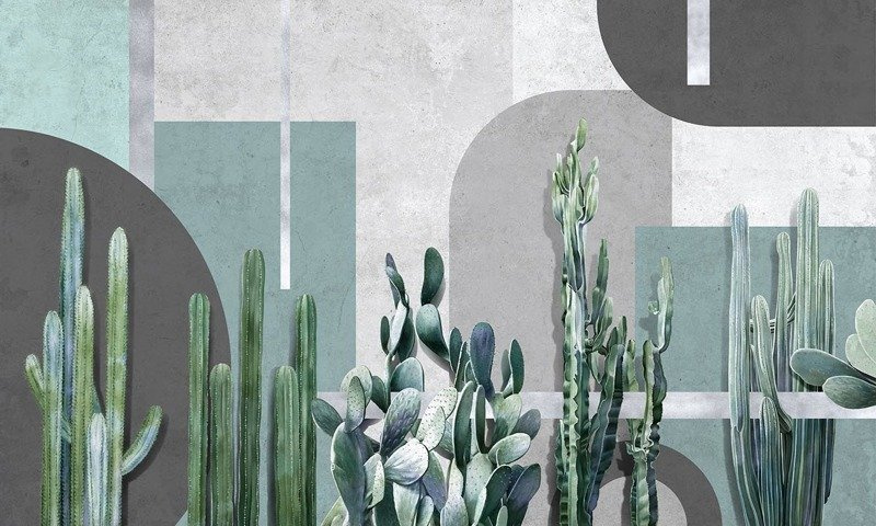 Kolekcja Latino to kompozycja olbrzymich kaktusów na geometrycznym tle. Kojarzą się z egzotycznymi, pustynnymi zakątkami świata. Szeroka gama kolorystyczna pozwoli dopasować mural do indywidualnych potrzeb - od stonowanych i delikatnych połączeń po bardzo kontrastowe i energetyzujące.