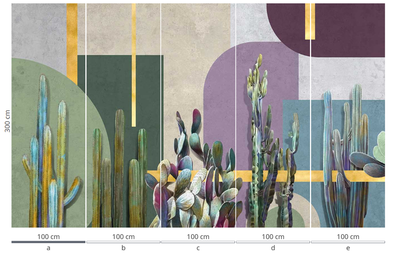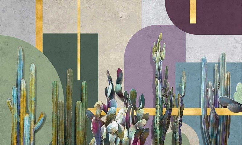 Kolekcja Latino to kompozycja olbrzymich kaktusów na geometrycznym tle. Kojarzą się z egzotycznymi, pustynnymi zakątkami świata. Szeroka gama kolorystyczna pozwoli dopasować mural do indywidualnych potrzeb - od stonowanych i delikatnych połączeń po bardzo kontrastowe i energetyzujące.