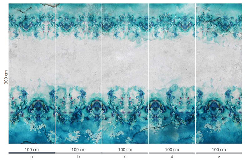 Murale marki Wonderwall sprzedajemy w rolkach o standardowych wymiarach: 100 cm x 300 cm. Jeśli wysokość waszego pomieszczenia jest mniejsza niż 3 metry, wówczas nadmiar tapety należy w odpowiednim miejscu odciąć. Na pełny wzór składa się pięć rolek: a, b, c, d i e. Można wybrać konkretne rolki dopasowując tapetę do swojego wnętrza. Lub można przygotować mural pod konkretny wymiar. W tym celu prosimy o kontakt pod mail sklep@iguane.pl
