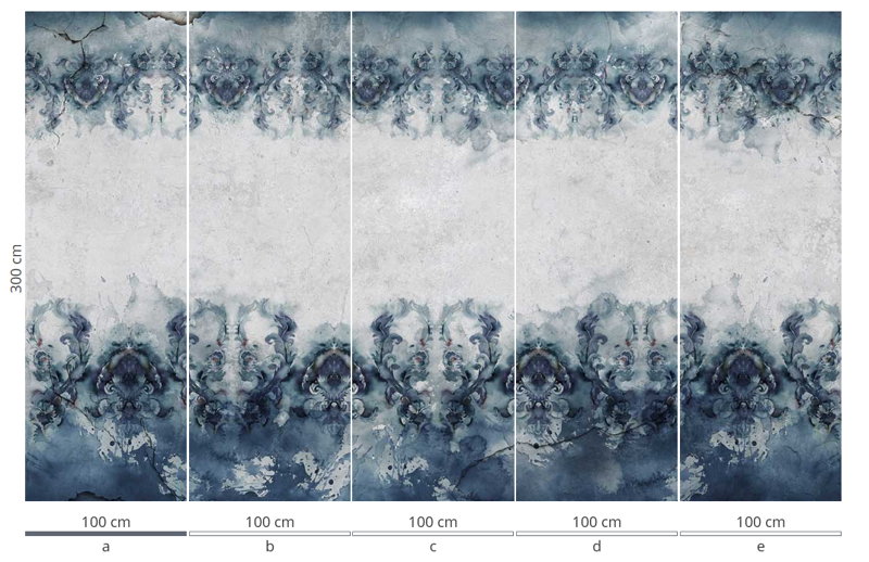 Murale marki Wonderwall sprzedajemy w rolkach o standardowych wymiarach: 100 cm x 300 cm. Jeśli wysokość waszego pomieszczenia jest mniejsza niż 3 metry, wówczas nadmiar tapety należy w odpowiednim miejscu odciąć. Na pełny wzór składa się pięć rolek: a, b, c, d i e. Można wybrać konkretne rolki dopasowując tapetę do swojego wnętrza. Lub można przygotować mural pod konkretny wymiar. W tym celu prosimy o kontakt pod mail sklep@iguane.pl