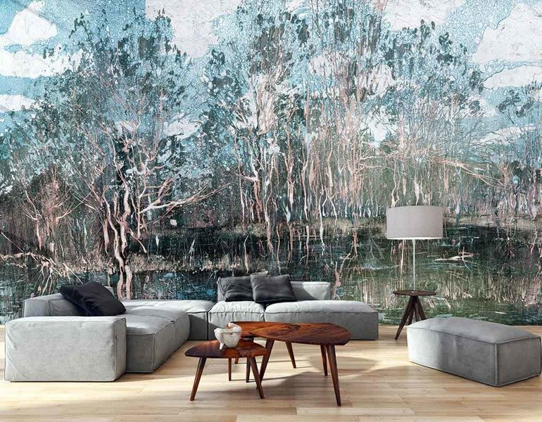 Mural Silva to wielkoformatowy pejzaż na twojej ścianie. Niebanalne połączenia kolorystyczne i motyw lasu intrygują od pierwszego spojrzenia.