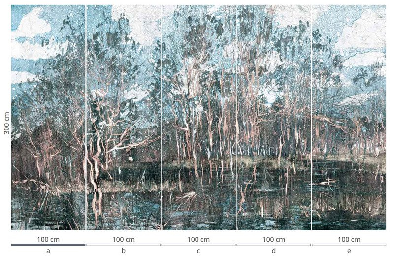 Murale marki Wonderwall sprzedajemy w rolkach o standardowych wymiarach: 100 cm x 300 cm. Jeśli wysokość waszego pomieszczenia jest mniejsza niż 3 metry, wówczas nadmiar tapety należy w odpowiednim miejscu odciąć. Na pełny wzór składa się pięć rolek: a, b, c, d i e. Można wybrać konkretne rolki dopasowując tapetę do swojego wnętrza. Lub można przygotować mural pod konkretny wymiar. W tym celu prosimy o kontakt pod mail sklep@iguane.pl