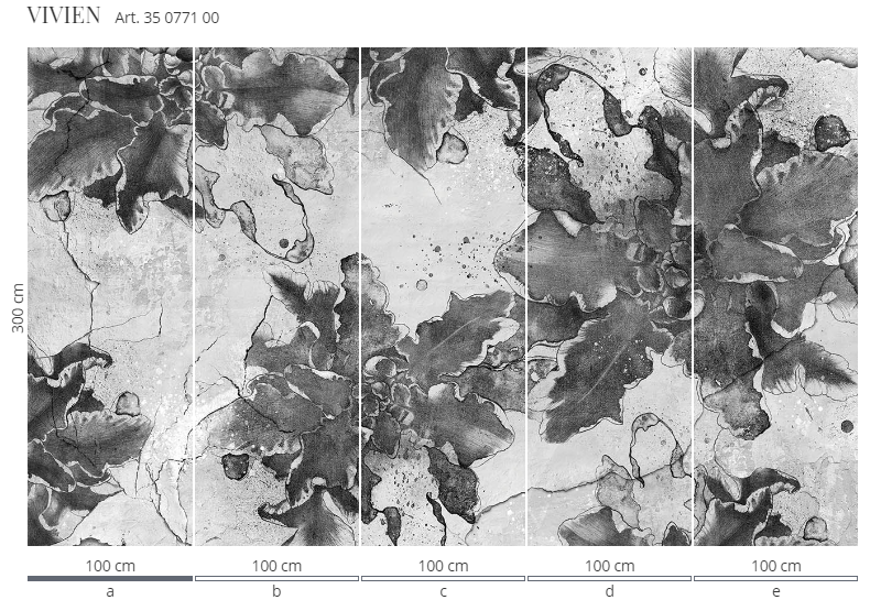 Murale marki Wonderwall sprzedajemy w rolkach o standardowych wymiarach: 100 cm x 300 cm. Jeśli wysokość waszego pomieszczenia jest mniejsza niż 3 metry, wówczas nadmiar tapety należy w odpowiednim miejscu odciąć. Na pełny wzór składa się pięć rolek: a, b, c, d i e. Można wybrać konkretne rolki dopasowując tapetę do swojego wnętrza. Lub można przygotować mural pod konkretny wymiar. W tym celu prosimy o kontakt pod mail sklep@iguane.pl