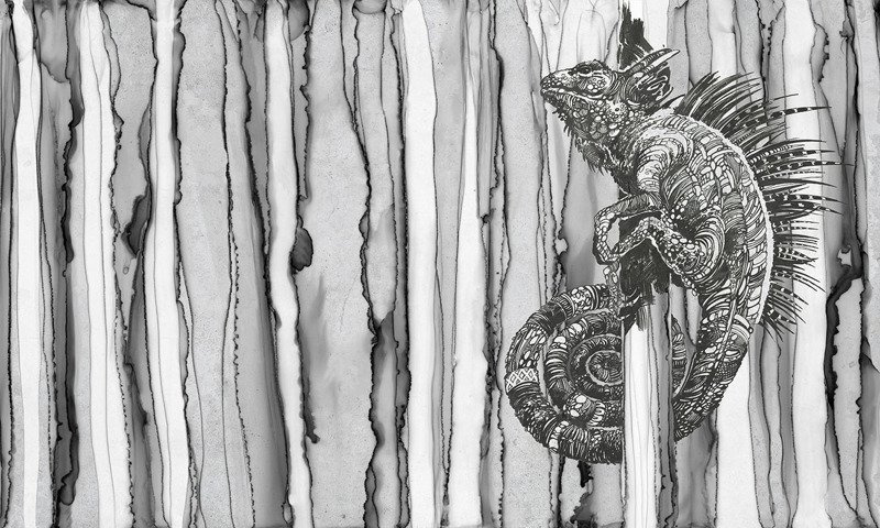 Pionowe rozmyte pasy z jaszczurką w roli głównej oto mural Jguana minimalistyczny ale z przytupem.