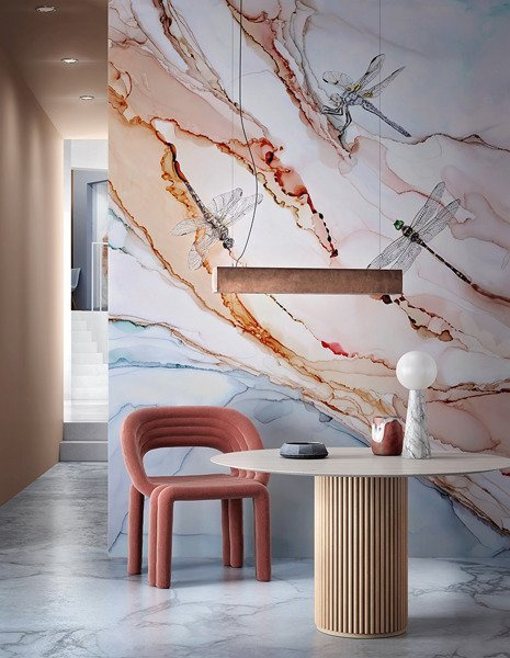 Mural imitujący kamień ozdobiony pięknymi, delikatnymi ważkami. Idealnie sprawdzi się w salonie jak i młodzieżowym pokoju.