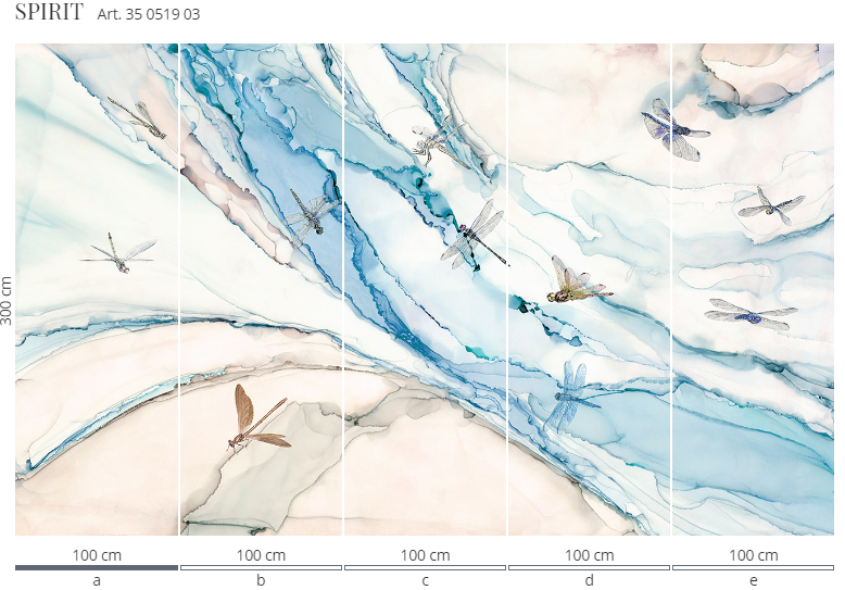 Murale marki Wonderwall sprzedajemy w rolkach o standardowych wymiarach: 100 cm x 300 cm. Jeśli wysokość waszego pomieszczenia jest mniejsza niż 3 metry, wówczas nadmiar tapety należy w odpowiednim miejscu odciąć. Na pełny wzór składa się pięć rolek: a, b, c, d i e. Można wybrać konkretne rolki dopasowując tapetę do swojego wnętrza. Lub można przygotować mural pod konkretny wymiar. W tym celu prosimy o kontakt pod mail sklep@iguane.pl