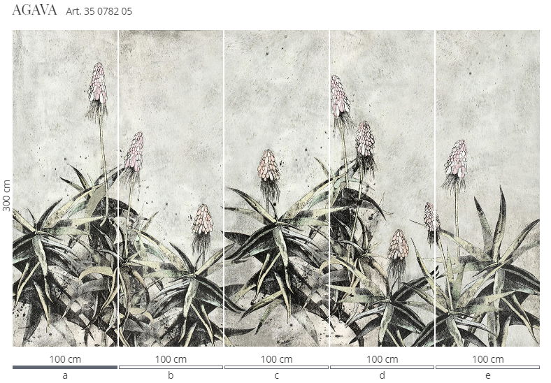 Murale marki Wonderwall sprzedajemy w rolkach o standardowych wymiarach: 100 cm x 300 cm. Jeśli wysokość waszego pomieszczenia jest mniejsza niż 3 metry, wówczas nadmiar tapety należy w odpowiednim miejscu odciąć. Na pełny wzór składa się pięć rolek: a, b, c, d i e. Można wybrać konkretne rolki dopasowując tapetę do swojego wnętrza. Lub można przygotować mural pod konkretny wymiar. W tym celu prosimy o kontakt pod mail sklep@iguane.pl