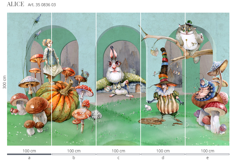Murale marki Wonderwall sprzedajemy w rolkach o standardowych wymiarach: 100 cm x 300 cm. Jeśli wysokość waszego pomieszczenia jest mniejsza niż 3 metry, wówczas nadmiar tapety należy w odpowiednim miejscu odciąć. Na pełny wzór składa się pięć rolek: a, b, c, d i e. Można wybrać konkretne rolki dopasowując tapetę do swojego wnętrza. Lub można przygotować mural pod konkretny wymiar. W tym celu prosimy o kontakt pod mail sklep@iguane.pl