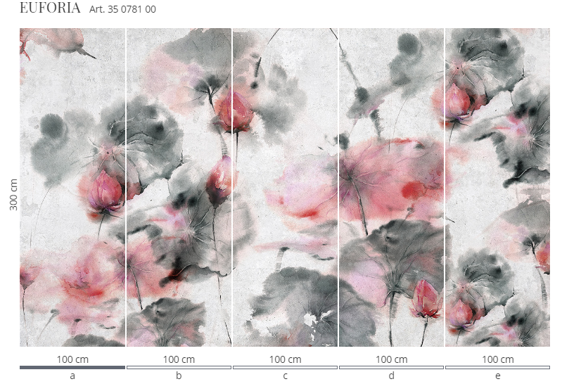 Murale marki Wonderwall sprzedajemy w rolkach o standardowych wymiarach: 100 cm x 300 cm. Jeśli wysokość waszego pomieszczenia jest mniejsza niż 3 metry, wówczas nadmiar tapety należy w odpowiednim miejscu odciąć. Na pełny wzór składa się pięć rolek: a, b, c, d i e. Można wybrać konkretne rolki dopasowując tapetę do swojego wnętrza. Lub można przygotować mural pod konkretny wymiar. W tym celu prosimy o kontakt pod mail sklep@iguane.pl