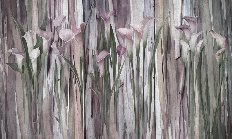 Wyłaniające się Kalie z trawy malowanej akwarelą. Nakładające się na siebie pasy o barwnej kolorystyce sprawią, że nasze pomieszczenie wyda się optycznie wyższe.