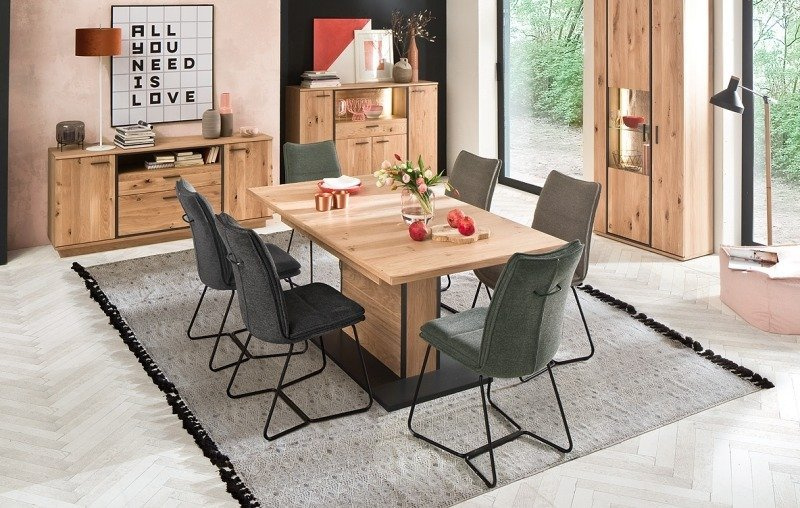 Komfortowe krzesło Haarlem swoją miękkość zawdzięcza sprężynom w siedzisku. Tkanina przypomina postarzaną skórę. Całości charakteru dodaje zewnętrzny szew. Podstawa w czarnym macie.