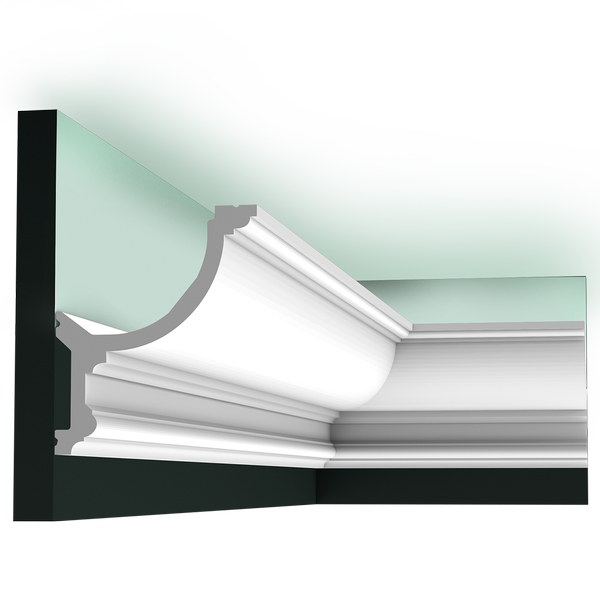 Gzyms C901 ćwierćwałkowy. Dzięki konstrukcji profilu istnieje możliwość zamontowania ciepłego oświetlenia rzutującego na sufit. Wykorzystywany jako gzyms oświetleniowy do oświetlenia pośredniego.