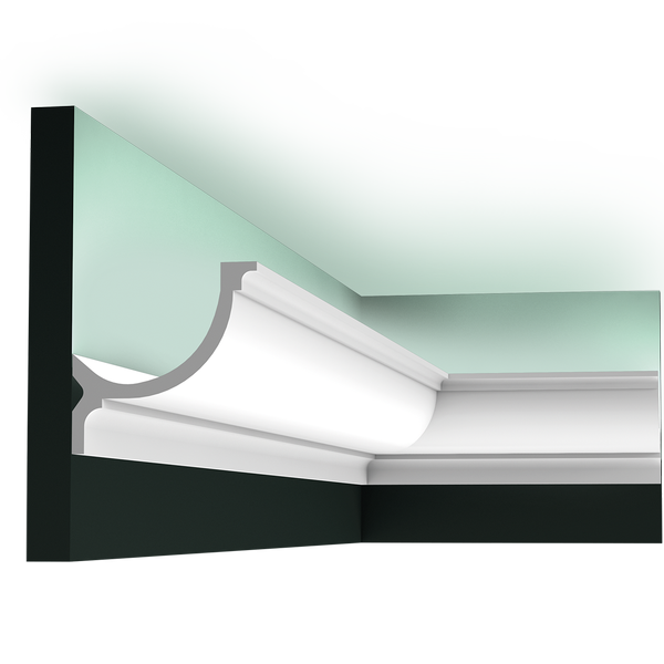 Gzyms C902 ćwierćwałkowy. Dzięki konstrukcji profilu istnieje możliwość zamontowania ciepłego oświetlenia rzutującego na sufit. Wykorzystywany jako gzyms oświetleniowy do oświetlenia pośredniego.