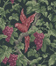 Papugi śliwkowe siedzą pod kwitnącym baldachimem liści i dojrzałych w słońcu winogron, a ich powierzchnia jest zadrukowana, aby zapewnić zachowanie tradycyjnych