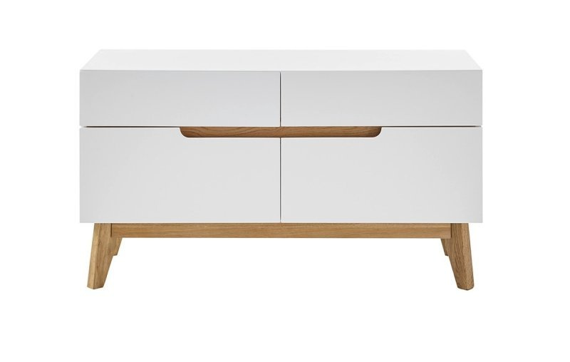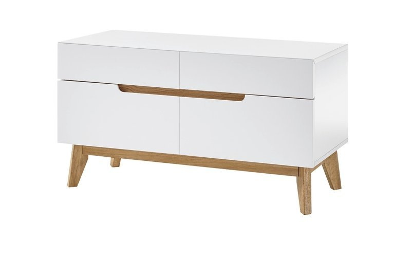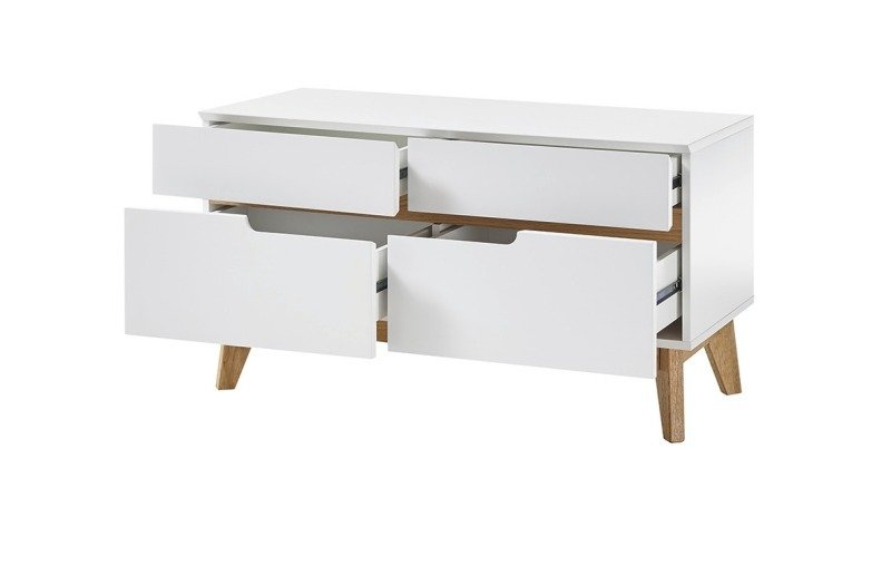 Cervo to kolekcja mebli w skandynawskim, minimalistycznym stylu. Meble wykończone lakierem białym matowym. Uroku dodają drewniane dębowe nogi. Aplikacje i cokoły wykonane z drewna pokryte okleiną dębową. Meble do samodzielnego montażu.