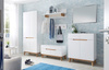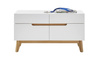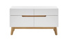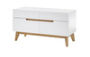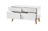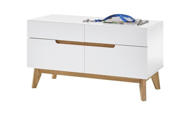 • Ławka, 4 szuflady, lakier biały mat, nogi dąb lity, aplikacje w okleinie naturalnej dębowej, olejowane